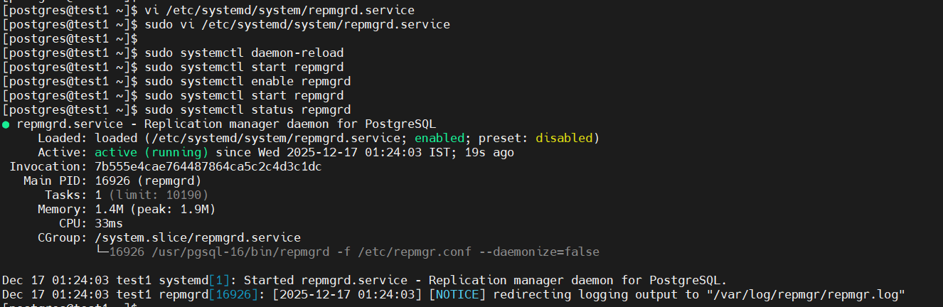 | 1 2 3 | sudo systemctl daemon-reload sudo systemctl enable repmgrd sudo systemctl start repmgrd |