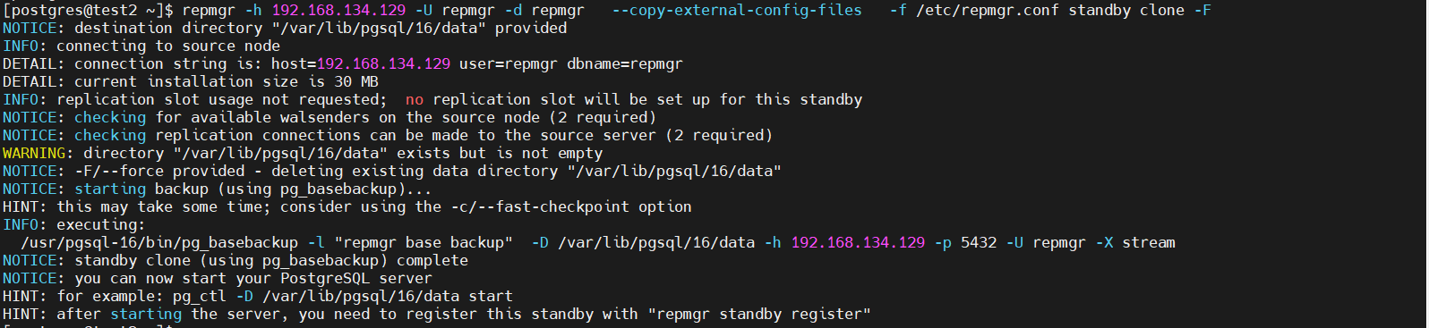 | 1 | repmgr -h 192.168.134.129 -U repmgr -d repmgr -f /etc/repmgr.conf standby clone -F |